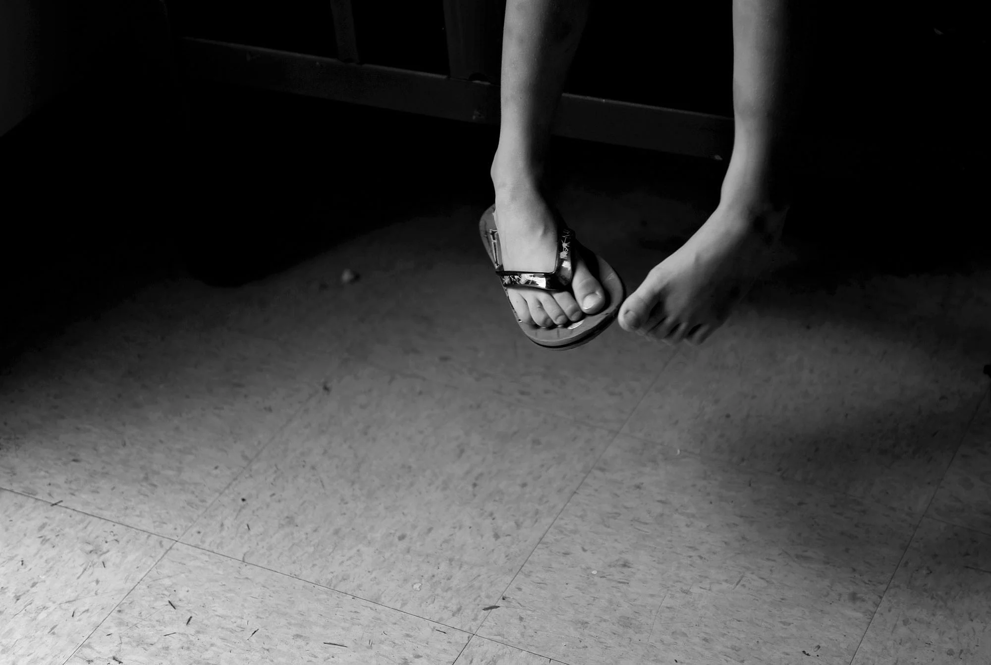 Aurora, 3, sits in her room at her family’s new home and gazes out her window at her first backyard, where she will be able to go outside and play.